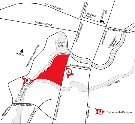 Exit Highway 417 (also called the "Queensway") at Bronson Avenue. Follow Bronson Avenue south approximately 2 kilometres. The campus entrance will be on the right at the intersection of Bronson and Sunnyside Avenue.