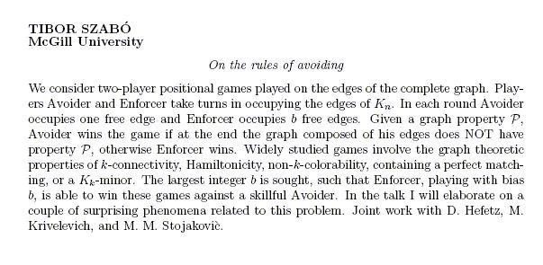models. Maximizing the number of colourings An old problem of Linial and Wilf asks for $f(n,m,l)$, the maximum number of $l$-colorings that a graph with $n$ vertices and $m$ edges can have. We solve this problem for every fixed $l$ when $C\le m\le cn^2$ for some $C,c>0$ depending on $l$ only. Moreover, for $l=3$, we we establish the structure of optimal graphs for all large $m\le n^2/4$ confirming (in a stronger form) a conjecture of Lazebnik from 1989. This is joint work with Po-Shen Loh and Benny Sudakov. -------------------------------------------------------------------------------- Minimal graphs having crossing number at least two The study of graphs minimal with crossing number at least 2 has